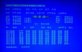 Der Monitor wird mit der Taste F12 aufgerufen. Dies kann nur aus dem Emulator heraus geschehen, aus dem Introscreen oder dem Tape-Manager ist der Aufruf nicht möglich. 4.1 Die AnzeigeIn der obersten Zeile wird die Überschrift sowie der aktuelle Modus des Emulators angezeigt. Darunter folgt die Anzeige des Befehlszählers (PC) sowie der aktuellen Daten auf die der Befehlszähler zeigt.In der nächsten Zeile findet sich die Anzeige des Stackpointers sowie die Anzeige der letzten Stackeinträge. Da die Stackoperationen jeweils 2 Bytes vom Stack lesen oder auf den Stack schreiben, ist die Anzeige der Stackeinträge auch 16-Bit weise organisiert. Darunter folgt die Anzeige der Prozessor-Register, wobei neben dem BC, DE und HL Register in Klammern der Inhalt der durch das Register adressierten Speicherzelle steht. Im nächsten Abschnitt folgt ein Hexdump, dessen Startadresse über den gesamten Adressbereich geändert werden kann. Näheres dazu im Abschnitt "Adress-Funktionen". In der letzten Zeile wird die Adresse des Breakpoints dargestellt, dieser ist nur aktiv, wenn das Monitorprogramm mit der Taste G verlassen wird. 4.2 Allgemeine SteuerungsfunktionenIn der folgenden Übersicht sind Funktionen wie das Beenden, Einzelschritt etc. aufgelistet.