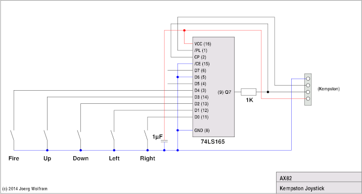 1 Kempston-JoystickEin entsprechender Anschluss ist bereits im Stromlaufplan und Layout vorgesehen. Entgegen ersten Entwürfen mit eigenem Mikrocontroller basiert das aktuelle Design auf einem 74LS165 (oder 74HCT Äquivalent) und einem Widerstand. Da das Timing sehr unkitisch ist (Taktfrequenz = Horizontalfrequenz), kann natürlich auch ein entsprechend programmierter Mikrocontroller die Aufgabe des LS165 übernehnem.