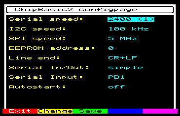 5.1.1 Exit (ESC)Mit dieser Taste werden die aktuellen Einstellungen verworfen und zum Hauptmenü zurückgekehrt.5.1.2 Change (F1)Mit jedem Tastendruck ändert sich die aktuell ausgewählte Einstellung.5.1.3 Serielle GeschwindigkeitAn dieser Stelle kann die Geschwindigkeit der seriellen Schnittstelle zwischen 1200 Bps, 2400 Bps, 9600 Bps und 38,4 KBps umgeschaltet werden. Die 9600/38400 Bps schalten die System-Schnittstelle von der Software-Schnittstelle (1) auf UART1 (2) um und sind nur beim Mega644P/Maga1284P verfügbar.5.1.4 I2C-GeschwindigkeitHier kann die Geschwindigkeit der I2C-Schnittstelle zwischen 100 und 400 kHz umgeschaltet werden. Die meisten I2C-Bausteine kommen mit 400kHz zurecht, aus Kompatibilitätsgründen kann auch die langsame Geschwindigkeit genutzt werden.5.1.5 SPI-GeschwindigkeitHier kann die Geschwindigkeit der SPI-Schnittstelle zwischen 156 kHz und 5 MHz umgeschaltet werden.5.1.6 EEPROM AdresseHiermit lässt sich die EEPROM-Adresse für das Daten-EEPROM einstellen (XPOKE/XPEEK).5.1.7 ZeilenendeMit dieser Taste kann die Art des Zeilenendes für die serielle und parallele Schnittstelle festgelegt werden. Möglich sind LF only (Unix/Linux), CR only (Mac) und CR+LF (Windows).5.1.8 Serielles Interface - TypMöchte man z.B. einen anderen RS232 Pegelwandler als die vorhandene Schaltung verwenden, kann dies hier umgeschaltet werden. Simple ist die original-Schaltung, mit Standard funktionieren RX und TX wie bei jedem anderen UART.5.1.9 Serielles Interface - EingangspinDa die ursprüngliche Beschaltung der seriellen Schnittstelle schon den TX1-Pin (PD3) des ATMega644P belegt, gibt es hier die Möglichkeit, den Eingangspin der seriellen System-Schnittstelle zwischen PD1 (notwendig für ATMega644P/ATMega1284P) und PD3 (Kompatibilitätsmodus) umzuschalten. Die Umschaltung ist für beide Typen möglich, allerdings lässt sich die zweite serielle Schnittstelle des 644P im Kompatibilitätsmodus nicht benutzen.5.1.10 AutostartWenn im Intro-Screen keine Taste gedrückt wird, kann ein Programm automatisch gestartet werden. Der in früheren Versionen vorhandene Autostart-Jumper wird nicht mehr abgefragt und sollte unbedingt offengelassen werden. Wählbar sind die Programme 1...7 sowie eine Dekativierung der Autostart-Funktion.5.1.11 Save (F2)Mit dieser Taste werden die aktuellen Einstellungen gespeichert und ein Neustart ausgeführt, um das System neu zu initialisieren.6 Der Fullscreen-Editor
