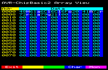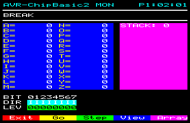 7.7 Nutzung der Screenshot-FunktionFür den Screenshot kann das Script screenshot.pl im tools-Verzeichnis benutzt werden. Es benötigt ImageMagick und wird mit "./screenshot.pl dateiname.endung" aufgerufen. Danach kann dann der Screenshot vom Controllerboard mittels rechts CTRL+P ausgelöst werden.Defaultmäßig ist der neue 16-Farb Modus eingestellt, um kompatibel zur 8-Farb Ausgabe zu sein, muß vor dem Datei-namen als Parameter -c8 angegeben werden. Der Screenshot im Videomode 7 ist nur als Bulk-Transfer realisiert, bei dem die Treiber-ID, die Palette und der gesamte Videospeicher übertragen werden. Defaultmässig sind bei den Tools 2400 Bps und /dev/ttyS0 als Schnittstelle eingestellt, bei Bedarf muß das Perl-Script entsprechend abgeändert werden. Für die erweiterete Schnittstelle des Mega644P ist das Script screenshot38.pl vorgesehen, die Schnittstelleneinstellungen entsprechen dem Transfer-Tool für diese Schnittstelle. Eine Alternative dazu ist das Programm konvert.pl. Dieses wandelt z.B. mit einem Terminalprogramm eingefangene Screenshots in Bilddateien um. Die bedienung ist gleich dem Screenshot-Programm, allerdings wird als erster Parameter die zu wandelnde Datei angegeben. 8 Der integrierte Monitor/DebuggerChipBasic2 enthält auch einen kleinen Monitor zum Debuggen. Augerufen wird er mit der Taste F12 während des Programmlaufes oder mit einer BREAK-Anweisung im Programm.8.1 Der HauptbildschirmDer Monitor kann nur in allen Videomodes aufgerufen werden, aber nur in VMODE 0 (Textmode) und im VMODE 5 (128x64) steht die volle Funktionalität zur Verfügung. Dies betrifft die Funtionen Go, Step und View da aufgrund des Speicherbedarfs in diesen Videomodi der Bildspeicher beim Aufruf des Monitors nicht gesichert werden kann.