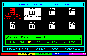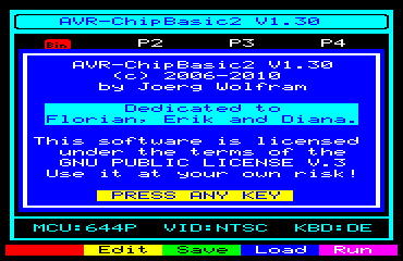 Darunter gibt es noch eine Anzeige für den Systemstatus. Ganz links Zeile steht der MCU-Typ, entweder 644 für den ATMega644 oder 644P für den ATMega644P. Daneben wird das aktive Videosystem (PAL oder NTSC) angezeigt. Rechts steht die Kurzbezeichnung für die aktive Tastaturtabelle. Um die Tastaturtabelle zu ändern, muss ein entsprechen- des (Binär-) Programm geladen und gestartet werden. Zum Beispiel kann mit dem Programm "kbd_us.bin" das Tasta- turlayout auf US-englisch umgestellt werden. Dazu wird das Programm entweder per XMODEM übertragen oder vom Disk-Modul geladen. Nachdem das Programm mit der F4-Taste gestartet wurde, ändert sich antsprechend die Anzeige im Systemstatus. In der untersten Zeile stehen die möglichen Kommandos, die Farben entsprechen den Tasten ESC und F1...F4 und haben folgende Funktionen: