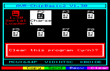 3.6 Programm senden (CTRL+F2)Mit dieser Funktion lässt sich ein Programm im Binärformat via X-Modem senden. Damit kann z.B. ein Programm zum AVR-Handheld übertragen werden. Für native AVR-Programme ist dies auch der einzige Weg zur Datenübertragung in Senderichtung, da AVR Programme nicht editiert werden können. Zum Ablauf ist zuerst das Senden zu aktivieren und anschließend auf der Empfängerseite die Übertragung zu starten.3.7 Programm empfangen (CTRL+F3)Mit dieser Funktion lässt sich ein Programm im Binärformat via X-Modem empfangen. Für native AVR-Programme ist dies auch der einzige Weg zur Datenübertragung in Empfangsrichtung, da AVR Programme nicht editiert werden können. Zum Ablauf ist zuerst die Senderseite zu aktivieren und anschließend mit CTRL+F3 die Übertragung zu starten.3.8 Programm löschen (CTRL+F4)Native AVR Programme lassen sich nicht mittels Editor löschen, dies kann aber mit der Tastenkombinatiion CTRL+F4 geschehen. Nach einer Sicherheitsabfrage wird dann das Programm gelöscht. Selbstverständlich können auf diesem Wege auch BASIC Programme gelöscht werden.