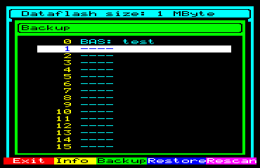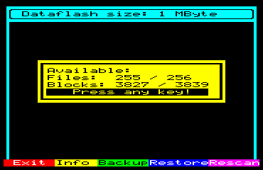 3.9 Binärprogramme, Bibliotheken und TreiberBinärprogramme, zu denen auch Bibliotheken und Treiber gehören, lassen sich auf jeden der 8 Programmplätze laden. Treiber funktionieren jedoch nur, wenn sie auf Programmplatz 8 geladen werden.4 Der FlashmanagerDer Flash-Manager (Symbol DFLASH im Hauptmenü) funktioniert natürlich nur dann, wenn auch ein Dataflash-Modul angesteckt ist. Ansonsten gibt es nur die Möglichkeit zum Rescan und Abbruch.Wurde ein Dataflash-Modul (es funktionieren nur 4 und 8 MBit Bausteine der serie AT45) erkannt, wird auf gültige Formatierung getestet. Formatieren?? Ja das gibt es hier auch, neben dem Blockstatus werden auch solche Dinge wie Schreibzähler angelegt. In der untersten Zeile stehen die möglichen Kommandos, die Farben entsprechen den Tasten ESC und F1...F4 und haben folgende Funktionen:
