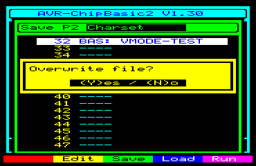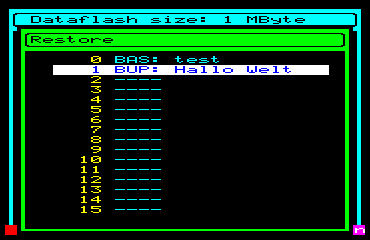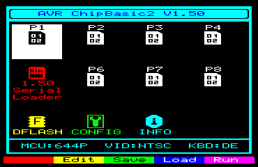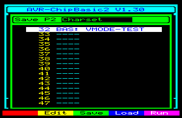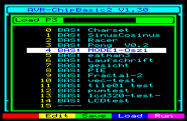 Mit den 3 Symbolen in der dritten Zeile können der Flashmanager, die Config-Page und ein Programminfo angezeigt werden. Näheres dazu in den entsprechenden Abschnitten. 3.4 Programm starten (F4)Startet das gewählte Programm. Dies funktioniert sowohl bei BASIC als auch nativen AVR Programmen. Nach Beendi- gung oder Abbruch des Pogrammes (Fehler, CTRL-C) erscheint am Rand ein rot-weisses Streifenmuster. Mit der ESC Taste wird wieder zum Menu zurückgekehrt. An dieser Stelle kann auch noch ein Screenshot gemacht werden, allerdings wird dabei die Randfarbe generell als schwarz ausgegeben. Dies gilt auch, wenn ein Programm aus dem Editor heraus gestartet wird.Die Tasten F1...F4 haben eine Zweitfunktion, wenn zusätzlich die linke CTRL oder STRG Taste gedrückt wird. Die Texte in den 5 Farbfeldern ändern sich dementsprechend: