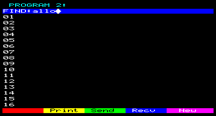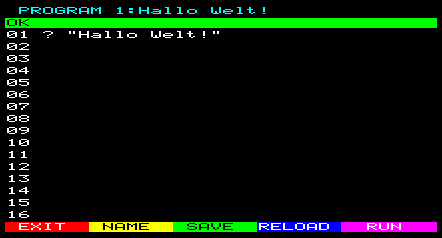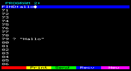 6.2 Die SuchfunktionAb version 1.31 ist eine Suchfunktion in den Editor integriert. Damit können kurze Textpassagen (maximal 16 zeichen) im aktuellen Programmtext gesucht werden. Die Suche ist case-sensitiv, das heißt es wird auf Groß- und Kleinschreibung geachtet. Aufgerufen wird die Suche mit der Tastenkombination CTRL+F. Die Farbe der Statuszeile ändert sich in blau, neben dem Text FIND: kann der Suchstring eingegeben werden. Ein weißes Rechteck markiert das aktuelle Ende des Suchstrings, Korrekturen können mit der Backspace-Taste vorgenommen werden.