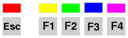 Die Tasten F1 bis F4 haben eine Zweitfunktion, wenn zusätzlich die CTRL oder STRG Taste gedrückt wird. Der Text in den 5 Farbfeldern ändert sich entsprechend: