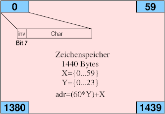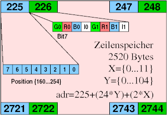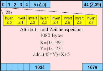 in den Bildschirmspeicher geschrieben werden, hier gibt es aber keinen linearen Zusammenhang zwischen Zeichenbytes