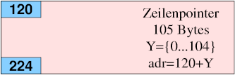 Eine Zeile im Bildschirmspeicher besteht aus 45 Bytes. Zuerst kommen 5 Bytes bei denen jeweils 1 Bit