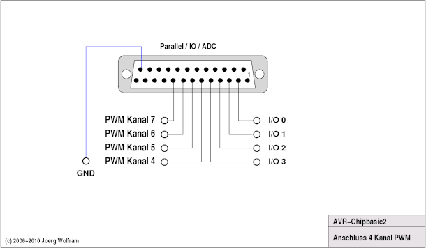 Die 4 PWM-Kanäle liegen an den Datenbits D4...D7 an, die Datenbits D0...D3 lassen sich