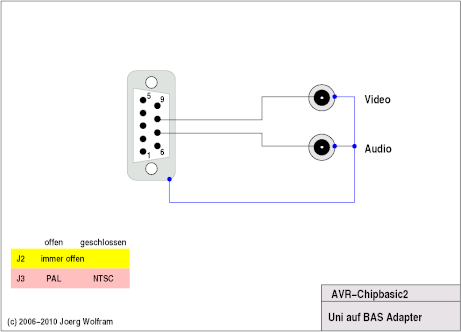 2 Video-Adapter für den Uni-Anschluss2.1 BAS-SignalDazu müssen einfach nur die Leitungen für das BAS-Signal (optional: Audio) und Masse angeschlossen werden. Hauptnachteil ist, dass die Darstellung nur in Schwarz/Weiss (Graustufen) erfolgt.
