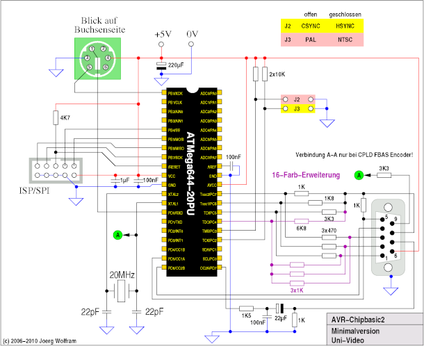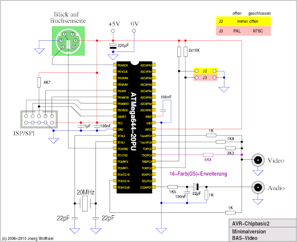 V1.50 (c) 2006-2015 Jörg Wolfram 1 Minimale Hardware1.1 Schwarzweiss BAS VersionFür eine minimale Beschaltung reicht schon ein Steckbrett, eine Streifenleiter- oder eine Lochrasterplatte aus. Lediglich die Steckverbinder passen in den meisten Fällen nicht. Bei Problemen mit der Tastatur empfiehlt es sich, für die Clock (PB0) und Datenleitung (PD0) jeweils einen Pullup-Widerstan von ca. 4,7K vorzusehen.