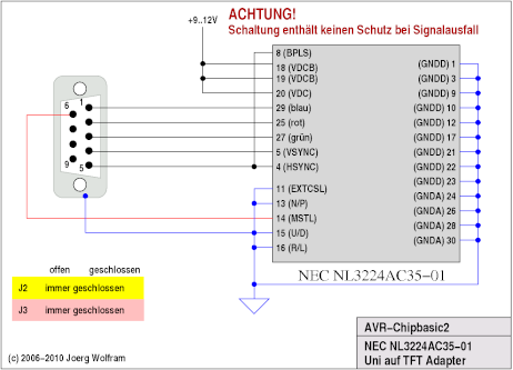 2.3 TFT-DisplayDas Beispiel zeigt beispielhaft den Anschluss von NTSC-TFT Displays, wie sie teilweise gebraucht oder als Ersatzteile erhältlich sind. Die Beschaltung ist nur eine Minimalvariante, insbesondere fehlt jeder Schtz des Displays vor Signalausfällen. Kritisch ist dabei eigentlich das HSYNC Signal, fällt es aus (z.B. beim Flashen des Mikrocontrollers über die ISP-Schnittstelle oder bei Ausfall der 5V-Versorgung) kann es zu bleibenden Schäden am Display kommen.