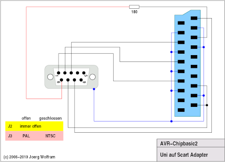 1.2 Farbversion (SCART)Damit lässt sich allerdings nur ein Graustufenbild ausgeben. Für Farbe auf dem TV benötigt man entweder einen FBAS-Encoder oder einen Scart-Anschluss. Letzterer ist die einfachere Lösung und lässt sich einfach realisieren. Über den 180-Ohm-Widerstand an Pin 18 des Scart-Steckers wird dem TV mitgeteilt, dass es die RGB-Eingänge nutzen soll. Bei manchen TVs mit mehreren Scart-Eingängen geht RGB nur am ersten, in dem Falle wird dann ein Graustufenbild dargestellt.