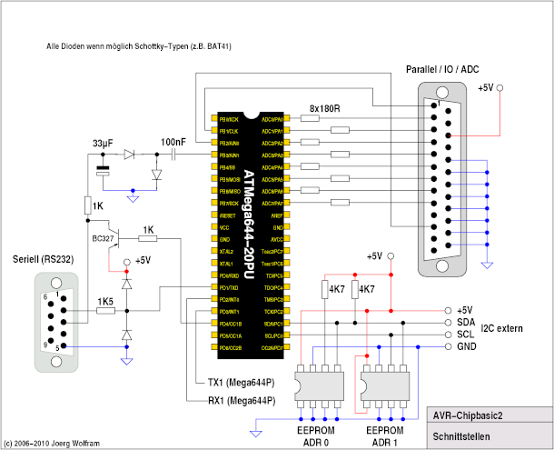 3.1 Die serielle SchnittstelleDa der USART bereits für den Tastaturanschluss verwendet wird, wird die serielle Schnittstelle in Software realisiert. Systembedingt lässt sich die TX(Sende)-Leitung aber nur 1 mal pro Bildschirmzeile aktualisieren. Daraus ergibt sich die recht niedrige Geschwindigkeit von nur 1200 bzw. 2400 Bps. Im Gegensatz zu anderen Lösungen wird dafür kein extra Schnittstellen-IC benötigt. Ein Timer-Ausgang bildet mit zwei Schottky-Dioden und zwei Kondensatoren eine Ladungspumpe, die ca. -4 V erzeugt. Diese liegt über einen Widerstand am TX-Anschluss an. Soll jetzt eine "0" ausgegeben werden, schaltet der Ausgang des Mikrocontrollers einen PNP-Transitor durch. Dadurch liegen am TX-Anschluss jetzt 5V (-Ucesat).Empfangsseitig wird die Eingangsspannung mittels Vorwiderstand und zweier Schottky-Dioden auf 0..5V begrenzt. Das Signal am Portpin ist dadurch zwar negiert, da die Ausertung in Software erfolgt ist das aber kein Problem. Alternativ lassen sich die Signalpegel auch so konfigurieren (Konfigurationsseite), dass ein "normaler" Schnittstellenwandler (z.B. MAX232) angeschlossen werden kann. 3.2 Die zweite serielle Schnittstelle (nur ATMega644P)Ab Version 1.25 kann auch die zweite serielle Schnittstelle des ATMega644P genutzt werden. Hier können z.B. Pegelwandler oder auch ein MIDI-Interface angeschlossen werden. Diese Schnittstelle lässt sich aber nicht als System-Schnittstelle nutzen. Zu beachten ist, dass das Eingangssignal der System-Schnittstelle dafür nunmehr an PD1 (Pin 15) anliegt und nicht mehr an PD3 (Pin 17). Diese Änderung ist leider notwendig geworden, um den zweiten UART des ATMega644P nutzen zu können. Über die Konfigurationsseite lässt sich zwischen beiden Pin-Varianten umschalten, wobei die zweite serielle Schnittstelle nur dann nutzbar ist, wenn der Eingang der ersten auf PD1 liegt. Diese Beschaltung lässt sich natürlich auch mit dem ATMega644 nutzen.3.3 Die parallele Schnittstellemit der parallelen Schnittstelle lassen sich nicht nur Drucker ansteuern, es können auch digitale Signale ausgegeben und abgefragt werden. Ausserdem können auch analoge Spannungen im Bereich 0-5V gemessen werden. Die beiden Steuersignale (Strobe und Busy) lassen sich aus dem BASIC heraus nicht direkt steuern sondern werden nur zum Anschluss von Druckern benötigt. An Pin 16 (/INIT) kann die interne +5V Spannung herausgeführt werden, damit können kleinere I/O Aufgaben auch mit der internen Stromversorgung gelöst werden. Alle Datensignale sind über Widerstände zur Strombegrenzung im Kurzschlussfall nach aussen geführt.3.4 Die I2C-SchnittstelleDie I2C-Schnitstelle nutzt das TWI-Interface im Mega644. Dieses ist identisch zu I2C, heisst aber aus lizenzrechtlichen Gründen anders.Der Signalautausch findet über zwei Leitungen, SCL (Serial Clock) und SDA (Serial Data) statt. Darüber können serielle EEPROMs, Temperatursensoren etc. angeschlossen werden. Damit die angeschlossene Peripherie nicht in jedem Fall eine extra Stromversorgung braucht, sind am I2C Anschluss auf der Platine auch +5V ond GND verfügbar. Ebenfalls auf der Platine befinden sich zwei 8-polige Sockel für serielle EEPROMs der Typen 24C64 ...24C512 wobei die Adressen 0 und 1 vorverdrahtet sind. Die genutzte Adresse lässt sich im Konfigurationsmenü einstellen, wobei XPOKE und XPEEK nur mit der voreingestellten Adresse funktionieren. 3.5 Die SPI-SchnittstelleDie SPI-Schnittstelle ist identisch mit der Programmierschnittstelle (ISP), an die auch das Dataflash-Modul angeschlossen wird. Ab der Version 1.38 ist es möglich, bis zu 8 Geräte an den SPI-Port anzuschließen. Dazu wird folgende Hardware benötigt:Die Funktionsweise ist dabei folgende:
