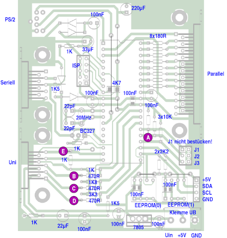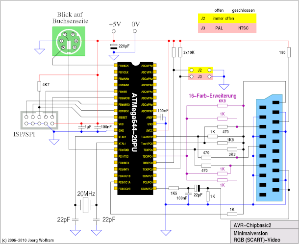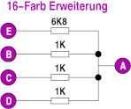 4.3 Die Erweiterung auf 16 FarbenDie Original-Leiterplatte war/ist universell auf 8 Farben ausgelegt, da die Varianten mit dem Mega16 und dem Mega32 sowie ältere ChipBasic2 Versionen den 16-Farb Modus nicht kennen. Auch die Käuflich erhältliche Leiterplatte ist in der derzeitigen Version nur auf 8 Farben ausgelegt. Mit 4 zusätzlichen Widerständen lässt sich die Baugruppe aber einfach auf 16 Farben "aufrüsten", die entsprechenden Punkte sind bereits auf dem Bestückungsplan violett markiert. Der 10 KOhm Widerstand vom Punkt (A) nach +5V hat keinen Einfluss auf die Funktion und braucht nicht entfernt zu werden.