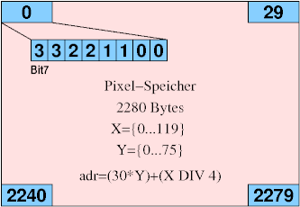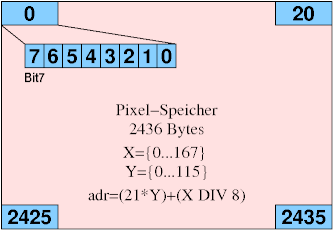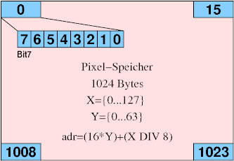 Die Pixelbytes sind von links nach rechts sowie von oben nach unten organisiert. Innerhalb des Bytes entsprechen