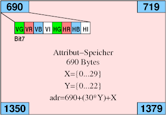 Die I (Intensitäts-) Bits sind nur von Relevanz, wenn die 16-Farben-Erweiterung angeschlossen ist. Die etwas