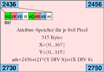 Die Pixelauflösung beträgt 168x116 Pixel, wobei für jeweils 8x8 (am unteren Rand nur 4x8) Pixel Vorder- und