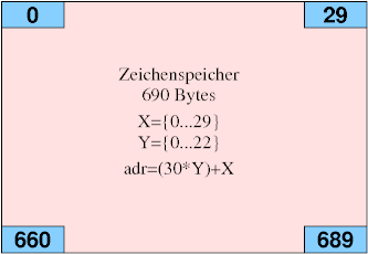 Für die Pseudografik sind die Zeichen 0...15 in 4 "Pixel" aufgeteilt. Bei 23 Zeilen a 30 Zeichen ergibt sich