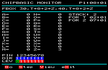 Danach folgt im linken Teil des Bildschirms die Anzeige aller Variablenwerte und rechts daneben der Stack. Jede FOR-Schleife und jedes CALL/XCALL erzeugt einen Eintrag auf dem Stack. Unter der Variablenliste wird der Status der parallelen Schnittstelle angezeigt. Zuerst die Pin-Nummern (1 entspricht D0), darunter die Datenrichtung (I oder O) und ganz unten der aktuelle Pegel. In der untersten Zeile stehen die möglichen Kommandos, der entsprechende Hotkey ist rot hinterlegt: