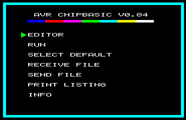 1 LizenzDas Programm unterliegt der GPL (GNU General Public Licence) Version 3 oder höher, jede Nutzung der Software/Informationen nonkonform zur GPL oder ausserhalb des Geltungsbereiches der GPL ist untersagt! Die Veröffentlichung dieses Programms erfolgt in der Hoffnung, dass es Ihnen von Nutzen sein wird, aber OHNE IRGENDEINE GARANTIE, auch ohne die implizite Garantie der MARKTREIFE oder der VERWENDBARKEIT FÜR EINEN BESTIMMTEN ZWECK.2 Geschichte und FeaturesNachdem ich mich nach langer 8051'er Zeit mit den mit der AVR-Assemblerprogrammierung beschäftigt hatte, war es einfach Zeit, die Grenzen ein bisschen auszuloten.Herausgekommen ist dabei ein kleiner in einer Tiny-Basic sehr ähnlichen Sprache programmierbarer Computer mit umfangreichen Schnittstellen und Funktionen. Als Eingabegerät dient eine normale PS2-Computertastatur, als Ausgabegerät ein Fernsehgerät mit Scart-Eingang (Farbe) oder BAS-Eingang (Graustufen) oder auch verschiedene PAL-/NTSC-taugliche TFT-Displays.