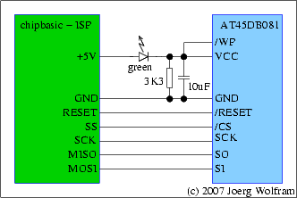 V0.96 (c) 2007-2011 Jörg Wolfram 1 LizenzDas Programm unterliegt der GPL (GNU General Public Licence) Version 3 oder höher, jede Nutzung der Software/Informationen nonkonform zur GPL oder ausserhalb des Geltungsbereiches der GPL ist untersagt! Die Veröffentlichung dieses Programms erfolgt in der Hoffnung, dass es Ihnen von Nutzen sein wird, aber OHNE IRGENDEINE GARANTIE, auch ohne die implizite Garantie der MARKTREIFE oder der VERWENDBARKEIT FÜR EINEN BESTIMMTEN ZWECK.2 DataFlashDas erste Zusatzmodul ist ein ATMEL DataFlash und wird auf den (normalerweise freien) ISP-Steckverbinder gesteckt. Die beiden Puffer können über das Array angesprochen werden und befinden sich im Anschluss an den internen Array-Bereich. Über die beiden Befehle FREAD und FWRITE können die Puffer mit dem Flash-Bereich kommunizieren. Funktionieren sollte das Ganze mit dem AT45DB041B (512 kBytes) und dem AT45DB081B (1MByte). Der Unterschied zwischen beiden Bausteinen liegt nur in der Anzahl der verfügbaren Pages (2048/4096).2.1 SchaltbildDa der Dataflash 2,7-3,3 Volt Versorgungsspannung braucht, wird diese einfach durch eine in Reihe geschaltete grüne LED mit ca. 1,8V Durchlassspannung erzeugt. Ein Widerstand mit 3,3kOhm bildet die Grundlast für die LED, parallel dazu liegt ein Abblock-Kondensator. Dieser sollte nicht zu klein sein, damit es beim Schreiben in den Flash keine Probleme gibt.
