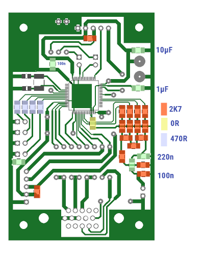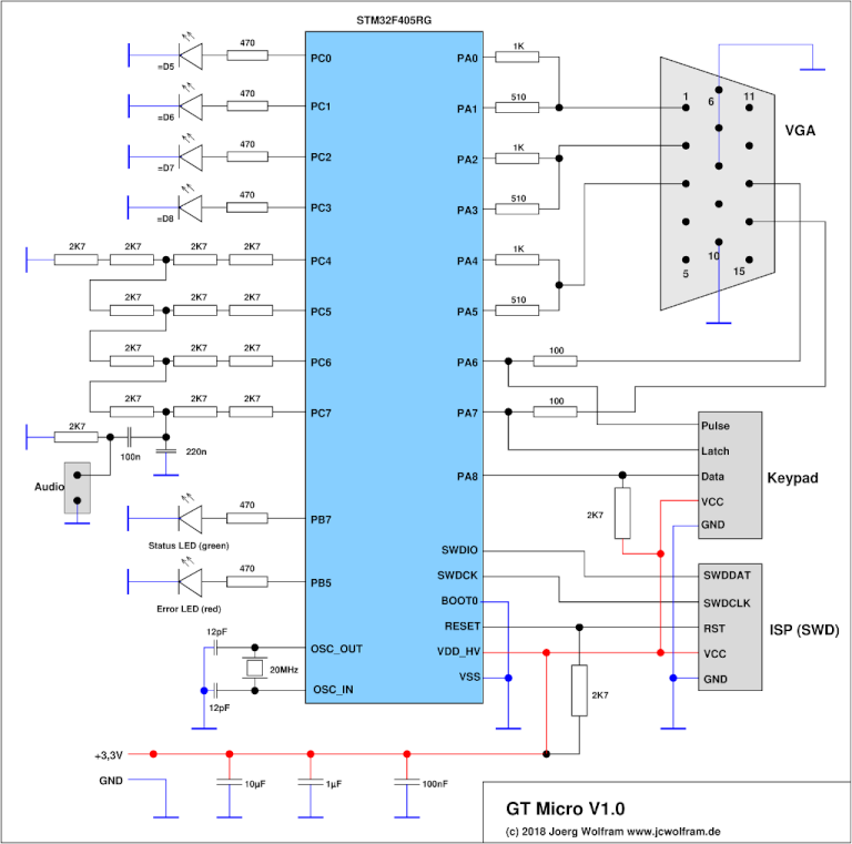 2 LeiterplatteDie Leiterplatte wurde mit gEDA PCB gezeichnet (gemalt) und ist einseitig mit ein paar Drahtbrücken realisiert. Die PCB-Datei und ein 600dpi PNG befinden sich im pcb-Verzeichnis des Projektarchives.Größtes Bauteil ist die VGA-Buchse, für die anderen Anschlüsse habe ich aus Platzgründen Pfostenverbinder benutzt. Damit können auch die Anschlüsse für Keypad und Audio besser in einem Gehäuse verteilt werden.