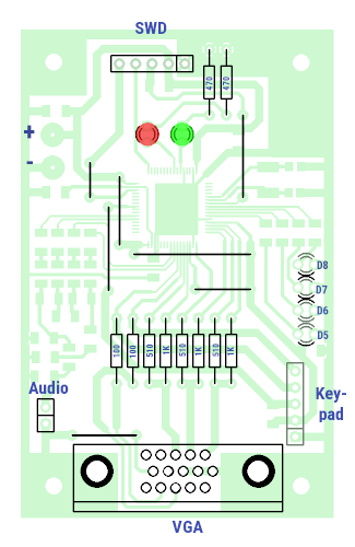 2 PCB LayoutThe PCB was designed (painted) with gEDA PCB. It is single sided with mixed components (DMD/THT) and a few wire jumpers. The PCB file and a 600dpi PNG is located in the pcb folder of the project archive.To reduce the PCB size, all connections except the VGA female connector are done as 1/10" female PCB headers.