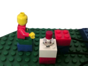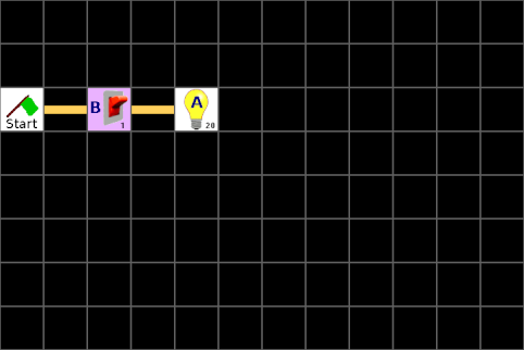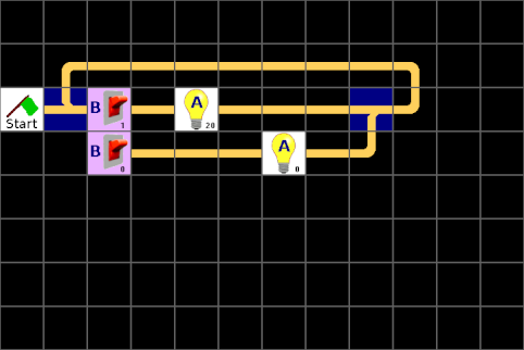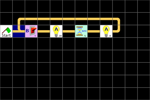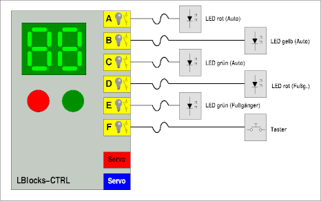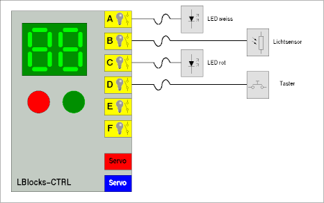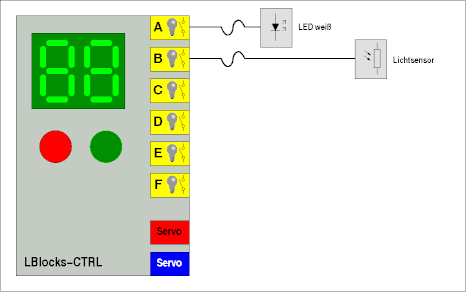 Wenn wir jetzt das Programm starten, sehen wir auf der Anzeige des LBlocks-Controllers, wenn der Lichtstrahl von der LED zum Fotowiderstand unterbrochen wird. Da man dazu ständig auf die Anzeige schauen muss, könnte man auch gleich den Durchgang bewachen. Also brauchen wir ein Signal welches und die Unterbrechung des Lichtstrahls meldet und welches danach wieder von Hand zurückgestellt werden muss. Dazu erweitern wir unsere Schaltung auf die folgende Weise: