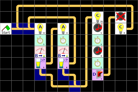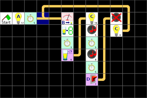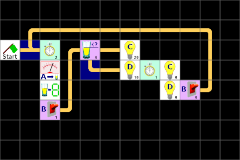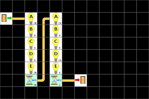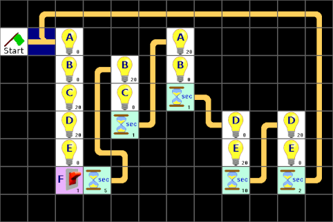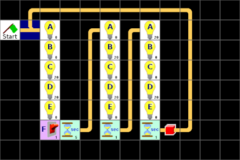Jetzt fehlt noch ein Element und zwar eine Zeit unter dem Stapel ganz rechts, aber die lässt sich irgendwie nicht aus der Liste dorthin ziehen. Leider gibt es eine Einschränkung. Und die legt fest, dass nur maximal 32 Elemente auf einer Seite sein dürfen. Das Gleiche gilt für maximal 32 Verbindungen, aber das ist nur ein theoretischer Wert, da 32 Elemente nie mehr als 32 Verbindungen haben können. Diese Einschränkungen haben sich bei der Entwicklung des LBlocks-Programmes ergeben und können auch nicht so einfach aufgehoben oder erweitert werden. Aber schauen wir uns unser Programm mal genau an, ob sich nicht ein paar Elemente einsparen lassen. Die Werte mancher Lampen ändern sich gar nicht, wenn zum nächsten Stapel gewechselt wird. Und jetzt? Die erste Lösung ist, nur die Lampen-Elemente zu benutzen, bei denen sich auch wirklich etwas ändert. Das dazugehörige Programm bleibt noch recht übersichtlich, wenn man gleiche Elemente nebeneinander setzt: