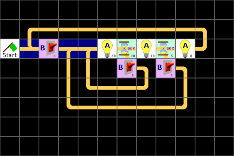 Jetzt könnte man als Aufgabe die Zeiten so verstellen, dass die Lampe immer nur kurz aufblitzt. 2.2 Geht es auch von Hand?Jetzt wollen wir aber nicht nur zusehen, sondern die Lampe (LED) selbst steuern. Dafür brauchen wir einen Taster, den wir an den Anschluß B anschließen.