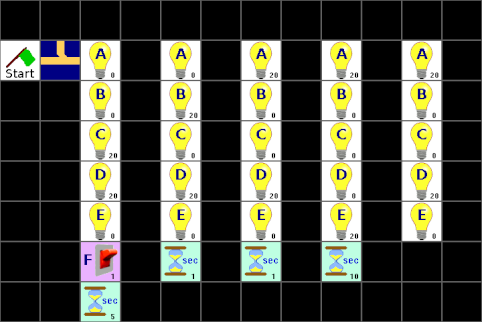 Im Programm versuchen wir, die oben beschriebenen Zustände als vertikale Stapel nachzubilden. Also die LEDs A bis E und darunter dann die Wartezeit bis zum nächsten Stapel oder auch den Taster.