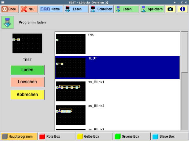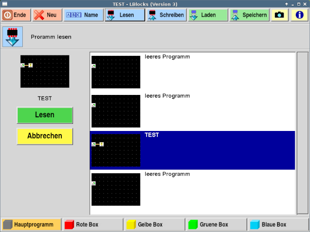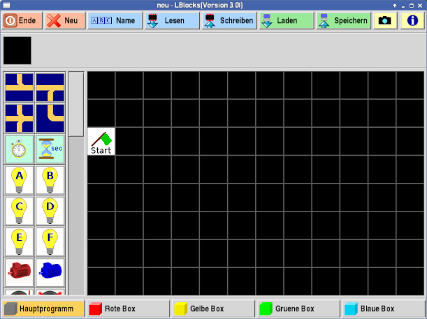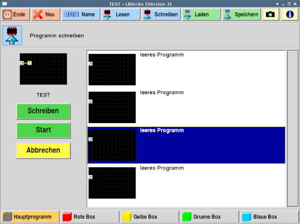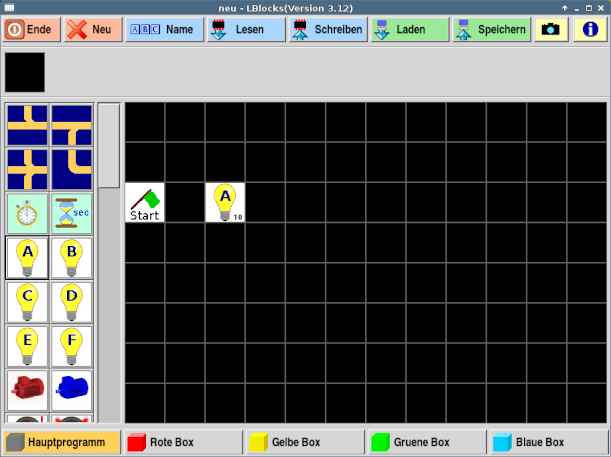 13.6 UnterprogrammeSicherlich ist schon die Leiste am unteren Bildrand aufgefallen, in der neben dem Hauptprogramm auch noch vier verschiedene Boxen ausgewählt werden können. Damit ist es möglich, Programme aufzuteilen wenn sie z.B. zu groß für ein "Arbeitsblatt`` werden, also nicht mehr in das Hauptprogramm passen.