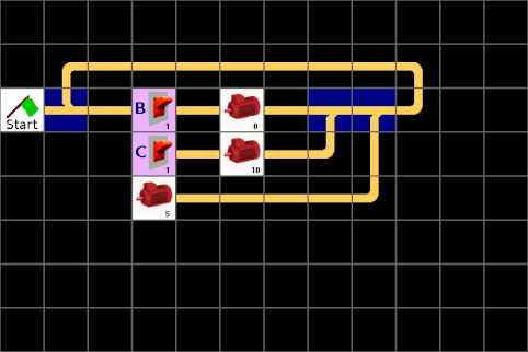 Wenn es nicht gleich gelingt, kann man auf die gleiche Weise Elemente innerhalb der Arbeitsfläche verschieben. Was nicht geht, Elemente auf bereits belegte Felder zu verschieben. Das kann man ausprobieren, indem man das Feld mit der Lampe auf das Startfeld zu ziehen versucht. Um Elemente aus der Arbeitsfläche zu löschen, muss man diese nur mit der linken Maustaste fassen und auf das Listenfeld ziehen, sozusagen wieder zurück in die Vorratskiste legen. Rechts unten im Feld mit der Lampe steht eine kleine "10". Bei einigen Element-Typen gibt es einen einstellbaren Eigenschaftswert, und dieser wird rechts unten im Feld angezeigt. Wenn man jetzt auf das Feld mit der roten Lampe klickt, bekommt es einen farbigen Rand und das Eigenschaften-Feld sieht jetzt anders aus: