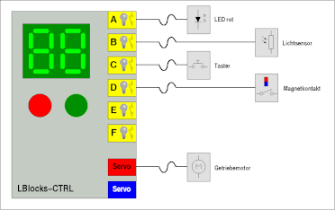 Links ist symbolisch der LBlocks Controller dargestellt, rechts daneben die verbundenen Peripheriebausteine. Da es keine Vorgaben gibt wie die Peripheriebausteine aussehen müssen, können Ihre Aufbauten natürlich stark von meinen abweichen. Aus diesem Grund werden alle Bausteine nur symbolisch dargestellt. Um die Peripheriebausteine möglichst flexibel nutzen zu können, habe ich diese in LEGO Bausteine eingebaut. Wie das aussehen und wie man sich selbst einen LBlocks-Controller bauen kann ist nicht Bestandteil dieses Büchleins, dafür gibt es die technische Dokumentation. Parallel dazu gibt es einen oder mehrere Logikpläne, da ein Programm aus mindestens einem Hauptprogramm und bis zu vier Unterprogrammen (Boxen) bestehen kann.