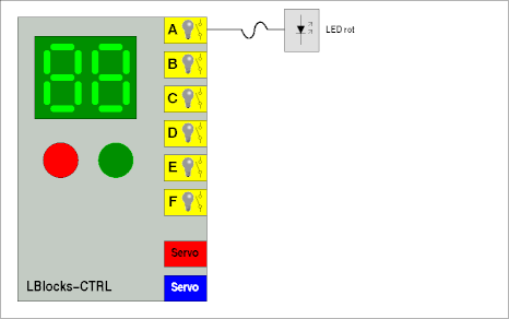 In jedem Controller können 4 unterschiedliche Programme gespeichert werden. Dazu gibt es im rechten Bereich eine Auswahlliste, mit den im Controller gespeicherten Programmen. Hier könne wir auswählen, auf welchen Programmplatz wir unser Programm speichern wollen. Als Beispiel verwende ich hier das 3.Programm. Links gibt es neben der obligatorischen Abbrechen-Schaltfläche eine mit Schreiben und eine mit Start. Die Funktion Abbrechen sollte eigentlich klar sein, mit Schreiben wird das Programm in den LBlocks-Controller geschrieben. Wird Start ausgewählt, wird das Programm in den Controller geschrieben und gleich gestartet. Das besondere daran ist, dass jetzt dieses Programm bei jedem Einschalten des LBlocks-Controllers gestartet wird. Aber jetzt reicht es aus, das Programm nur in den Controller zu schreiben. Nun kann das Programm am Controller gestartet werden. Dazu wird mit der Stop-Taste das Programm 3 gewählt (Anzeige P3) und mit der Starttaste gestartet. Die "RUN"-LED leuchtet und auf der Anzeige steht - -. Das bedeutet, dass das Programm zu Ende ist. Naja, viel gab es da wohl nicht zu sehen... Aber halt, was war mit der Lampe an Anschluss A? Die war ja gar nicht angeschlossen. Also drücken wir die Stop-Taste am Controller und schließen eine Lampe (LED) an den Anschluß A an.