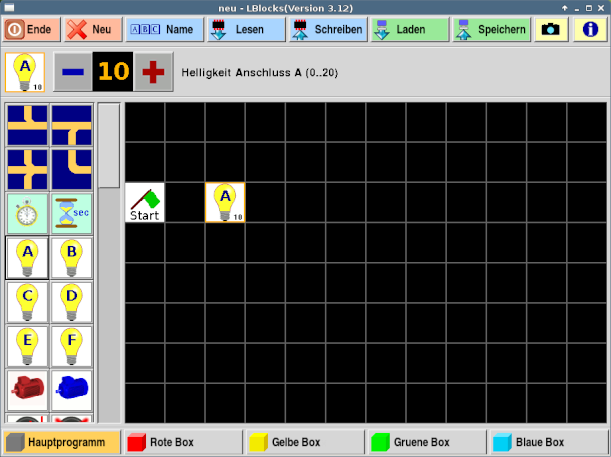 Unter dem Eigenschaften-Feld, welches jetzt nur noch ein schwarzes Quadrat als Symbol enthält folgen folgen der Listenbereich und die Arbeitsfläche. Darunter sind noch 5 Felder, wovon eins einen gelben Hintergrund hat und die anderen nur einen grauen. Damit kann zwischen 5 verschiedenen Arbeitsflächen umgeschaltet werden. Am Anfang werden wir uns jedoch nur auf der Hauptprogramm-Arbeitsfläche bewegen. Klickt man auf ein Element im Listenbereich, so wird im Eigenschaften-Feld ein Hinweis auf die Funktion dieses Elements angezeigt. Wenn keine Beispiele intalliert und auch kein Controller eingerichtet werden soll, kommt man zu diesem Pnkt auch durch klicken auf das große Bild auf der rechten Seite des Fensters. Das Bild verschwindet und es kommt ein Raster von 8 mal 12 Feldern zum Vorschein. Das ist sozusagen unsere Arbeitsfläche. Links daneben gibt es einen Bereich in dem wie in einer Liste alle verfügbaren Elemente angeordnet sind. Im weiteren Verlauf werde ich diesen als Listenbereich bezeichnen. Klickt man auf ein Element im Listenbereich, so wird im Eigenschaften-Feld ein Hinweis auf die Funktion dieses Elements angezeigt. 6 Ein Programm entstehtDie meisten Felder auf der rechten Seite sind schwarz, nur auf der linken Seite sehen wir win weißes Feld mit einer grünen Flagge. Das ist das Startfeld, bei dem alle Programme beginnen. Jetzt werden wir ein erstes Element in unser Programm einfügen. Und zwar wollen wir eine Lampe einschalten. Dafür gibt es das Listenfeld mit einer Glühlampe und dem Buchstaben A als Symbol. Klicken wir auf dieses Feld, wird "Helligkeit Anschluss A" angezeigt. Damit ist der Anschluss A am Controller gemeint, wir können eine Lampe dort anschließen und deren Helligkeit mit diesem Feld festlegen.Also ziehen wir jetzt das Feld mit der Lampe vom Listenfeld auf die Arbeitsfläche. Das geht indem man auf das Feld im Listenbereich mit der linken Maustaste klickt und bei gedrückter Maustaste auf die Arbeitsfläche zieht. Dabei bleibt das Symbol sozusagen am Mauszeiger "kleben". Das gerade aktive Feld auf der Arbeitsfläche wird mit einem hellgrauen Rechteck markiert, wird jetzt die Maustaste losgelassen befindet sich nun an der Stelle das Feld mit der Lampe. Ziel ist es, die Lampe rechts neben dem Startfeld zu platzieren und dabei ein Feld Zwischenraum zu lassen. Das Ergebnis sollte nun so aussehen:
