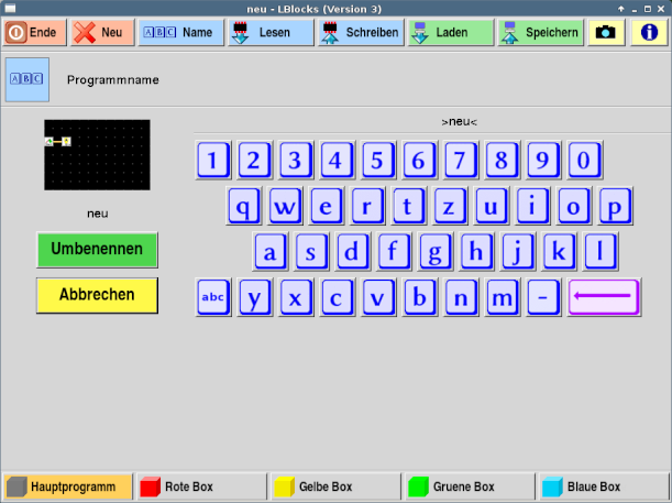 Wir hätten auch das Lampen-Element direkt rechts neben dem Startfeld positionieren können, das Ergebnis wäre das gleiche. Die Anordnung der Elemente neben- und untereinander bestimmt die Reihenfolge, wie der Controller die Elemente abarbeitet. In diesem Fall besteht das Programm aus dem Startfeld, welches immer vorhanden ist und unserem Lampen-Element. Nachdem beide Elemente abgearbeitet sind, wird das Programm anhalten. Später werden wir noch sehen, dass Elemente auch untereinander angeordnet werden können, vorerst genügt uns dieses einfache Programm. 7 Das Ding bekommt einen NamenGanz oben in der Titelleiste des Fensters steht der Programmname, zu Beginn ist er immer Neu. Da das kein besonders aussagekräftiger Name für unser Programm / Experiment ist, wollen wir ihn jetzt ändern. Dazu klicken wir in der Aktionsleiste auf die blaue Schaltfläche mit der Aufschrift Name und statt unserer Arbeitsfläche sehen wir jetzt ein verkleinertes Bild von unserer Arbeitsfläche und daneben den aktuellen Name des Programmes. Darunter ist eine Bildschirmtastatur zu sehen.