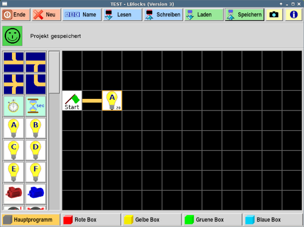 Mit einem Klick auf das Umbenennen-Feld wird wieder zurück zur Arbeitsfläche gewechselt und der Name in der Titelleiste des Fensters hat sich in "TEST" geändert. 8 Speichern im ComputerWürden wir jetzt das Programm beenden wäre unser Programm "weg", also wollen wir es im Computer dauerhaft speichern. Das geht ganz einfach, ein Klick auf die Schaltfläche "Speichern" in der Aktionsleiste genügt. Ein grünes Symbol im Eigenschaften-Feld zeigt an, dass die Aktion erfolgreich war: