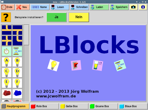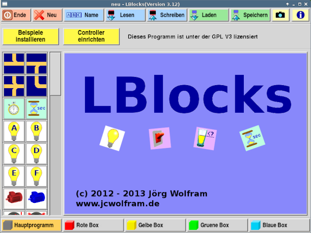 Um die eigenen Experimente zu dokumentieren ist übrigens die Snapshot-Funktion gedacht. Diese wird über die Schaltfläche mit dem Fotapparat ausgelöst und speichert das Bild im PNG-Format als "screenshot.png" im lblocks Ordner im Benutzerverzeichnis. 4 ProgrammstartEigentlich gibt es zwei Programme. Das "normale" lblocks für Auflösungen ab 1024x768 und ein lblocks-small welches auch für kleinere Auflösungen ab 640x480 geeignet ist. Die X86-Binärdateien sind für PCs mit 32-Bit und 64-Bit (mit zusätzlichen 32-Bit Bibliotheken) geeignet, die ARM-Binärdateien wurden auf einem Emulator für das Raspberry Pi getestet.Das Programm kann direkt vom Desktop oder auch aus einer Konsole heraus gestartet werden. Im letzteren Fall lässt sich Fehlverhalten des Programmes leichter diagnostizieren, da z.B. auch die Meldungen des Programmers hier angezeigt werden. Auch gibt es