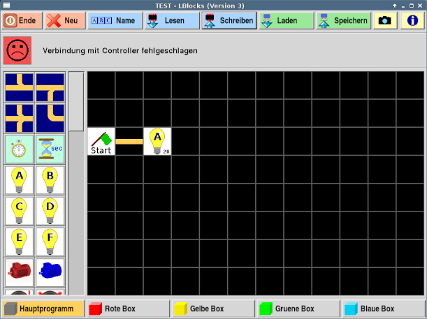 Wenn wir jetzt wieder sie Start-Taste drücken, kommt zwar wieder die Anzeige - -, die LED am Anschluss A sollte aber jetzt hell leuchten. Nach Betätigen der Stop-Taste wird wieder P3 angezeigt und die angeschlossene LED ist wieder aus. 11 ...Und wieder zurückNatürlich können auch Programme vom LBlocks-Controller in den Computer geladen werden um sie beispielsweise zu ändern. Und, wer hätte das gedacht, dazu dient die Schaltfläche "Lesen" in der Aktionsleiste.