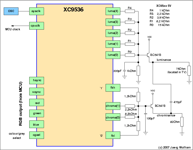 Das in VHDL geschriebene Design passt in ein preiswertes XC9536 CPLD, solange entweder nur PAL oder nur NTSC